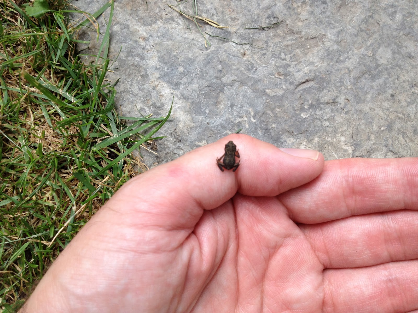 So, the other day, I'm walking in the back yard, look down and think I see a beetle crawling through the grass. On closer, inspection, it turned out to be a baby toad! I saw more that day and have seen others since then and I can't get over how happy it makes me. It seems our still pond was a successful nursery for toad tadpoles (toadpoles?). There are still a few left in the pond and many have limbs, so they will soon be ready to leave and find new homes. I can't get over how small and perfectly formed they are and wonder what on earth they eat. Nice to know we have contributed to the amphibian life cycle and it would be great if some set up home in the front yard's stone hibernaculum. Now there's a word of the day!